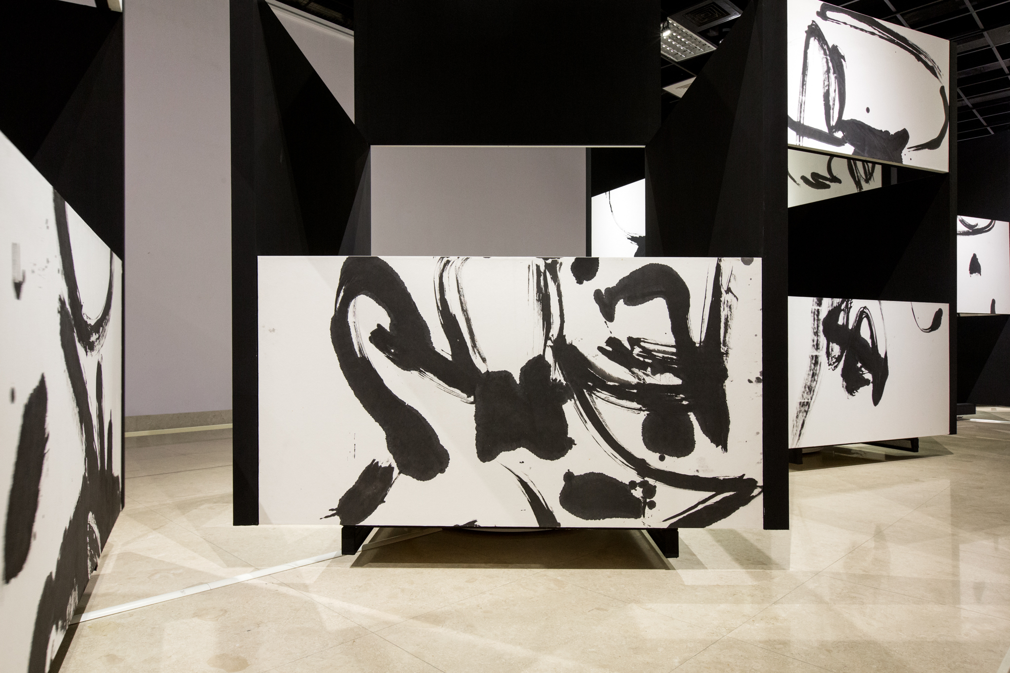L’exposition 16384, réalisé pour le New Taïpei City Art Center, repose sur un dialogue entre l’artiste taïwanaise Tong Yang Tze, peintre et calligraphe de renommée internationale, et le studio ACD. L’artiste a mis à disposition du studio un ensemble de fragments d’œuvres partageant un même format, celui du papier traditionnel chinois, que le studio a intégré dans une scénographie comportant 7 mobiles motorisés de grande dimension. Les mobiles peuvent chacun prendre 4 orientations distinctes, offrant au dispositif un ensemble de 16 384 combinaisons jouant avec le contraste noir et blanc des peintures dans les 3 dimensions de l’espace. Les mobiles, s’ils s’apparentent à certaines créations de l’art cinétique, servent avant tout à développer un mode de recomposition original.