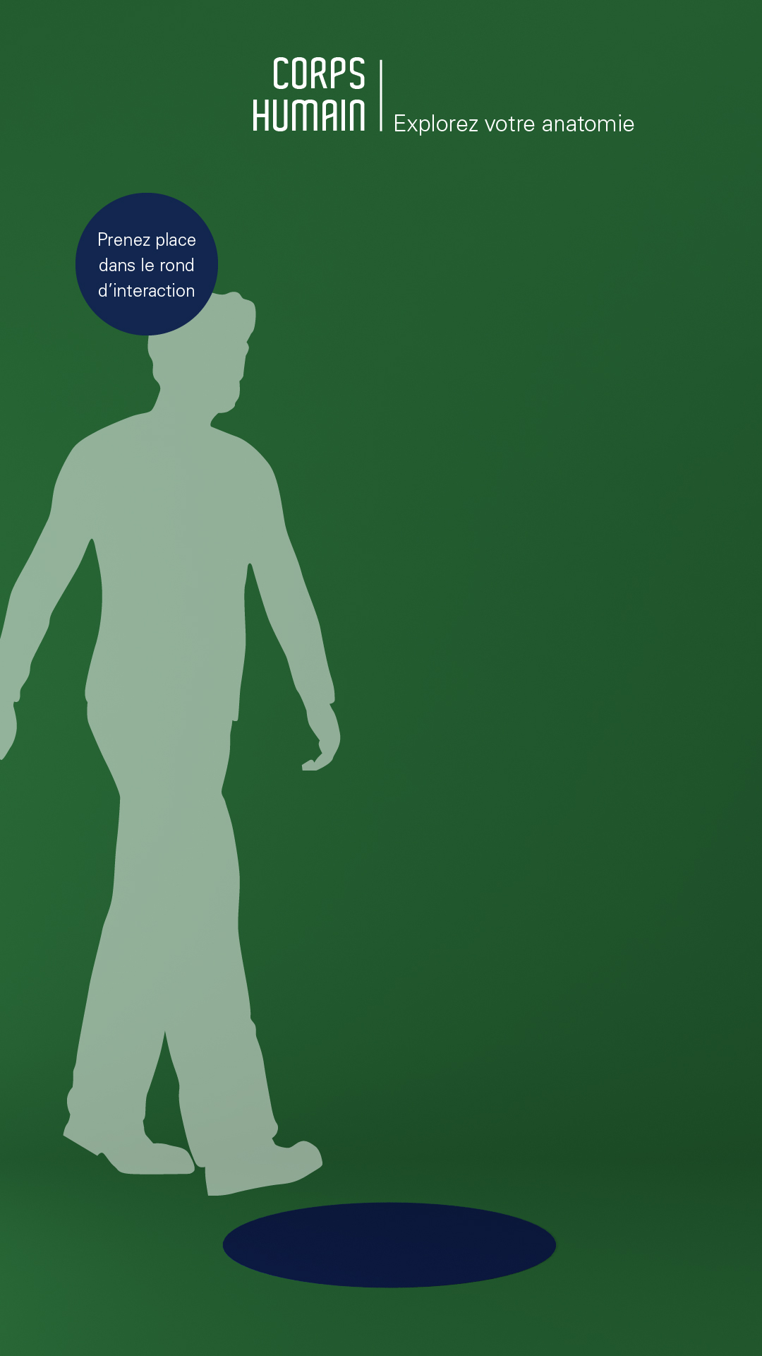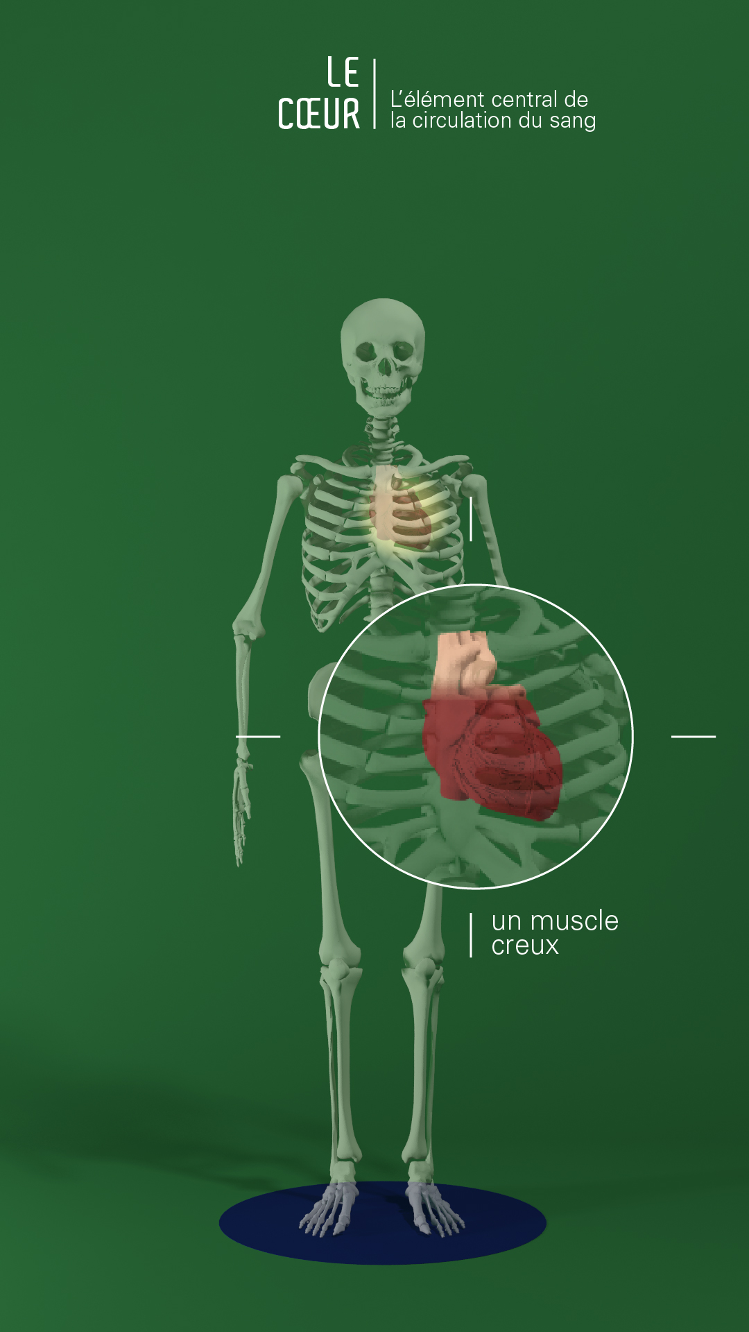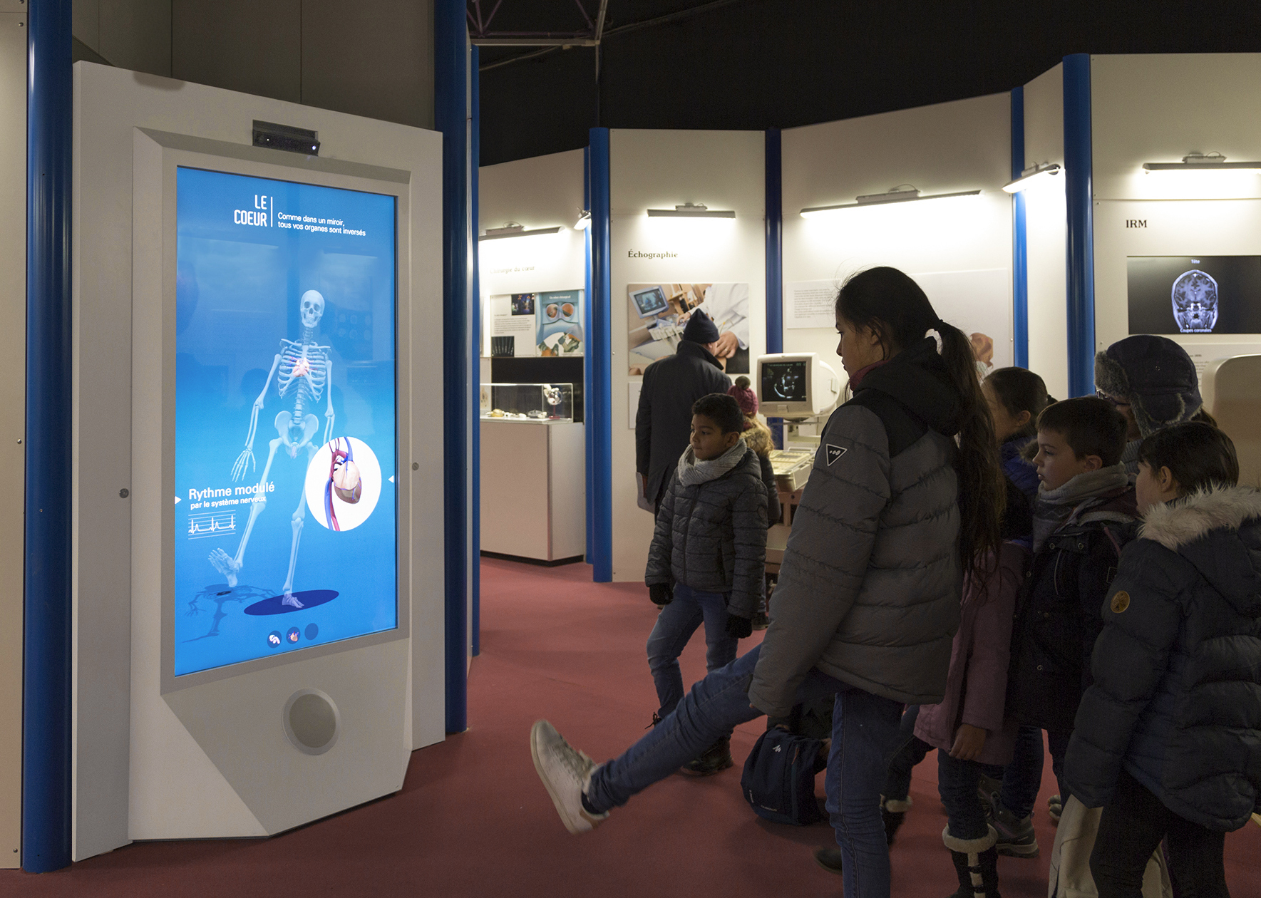 Le dispositif Anatomie augmentée du public du Palais de la Découverte propose d’aborder l’anatomie humaine en utilisant comme support son propre corps. Prenant place dans la zone d’interaction, le visiteur fait apparaître sur l’écran un squelette reproduisant ses mouvements par un effet de miroir virtuel. Il peut alors sélectionner différents organes qu’il doit placer au bon endroit , bénéficiant en retour d’une animation scientifique sur leur rôle au sein de son organisme. Au delà de la dimension scientifique, l'enjeu du dispositif est ici l'élaboration d'une interface simple et sans contact physique, permettant au visiteur une interaction basée sur les mouvements de son corps.