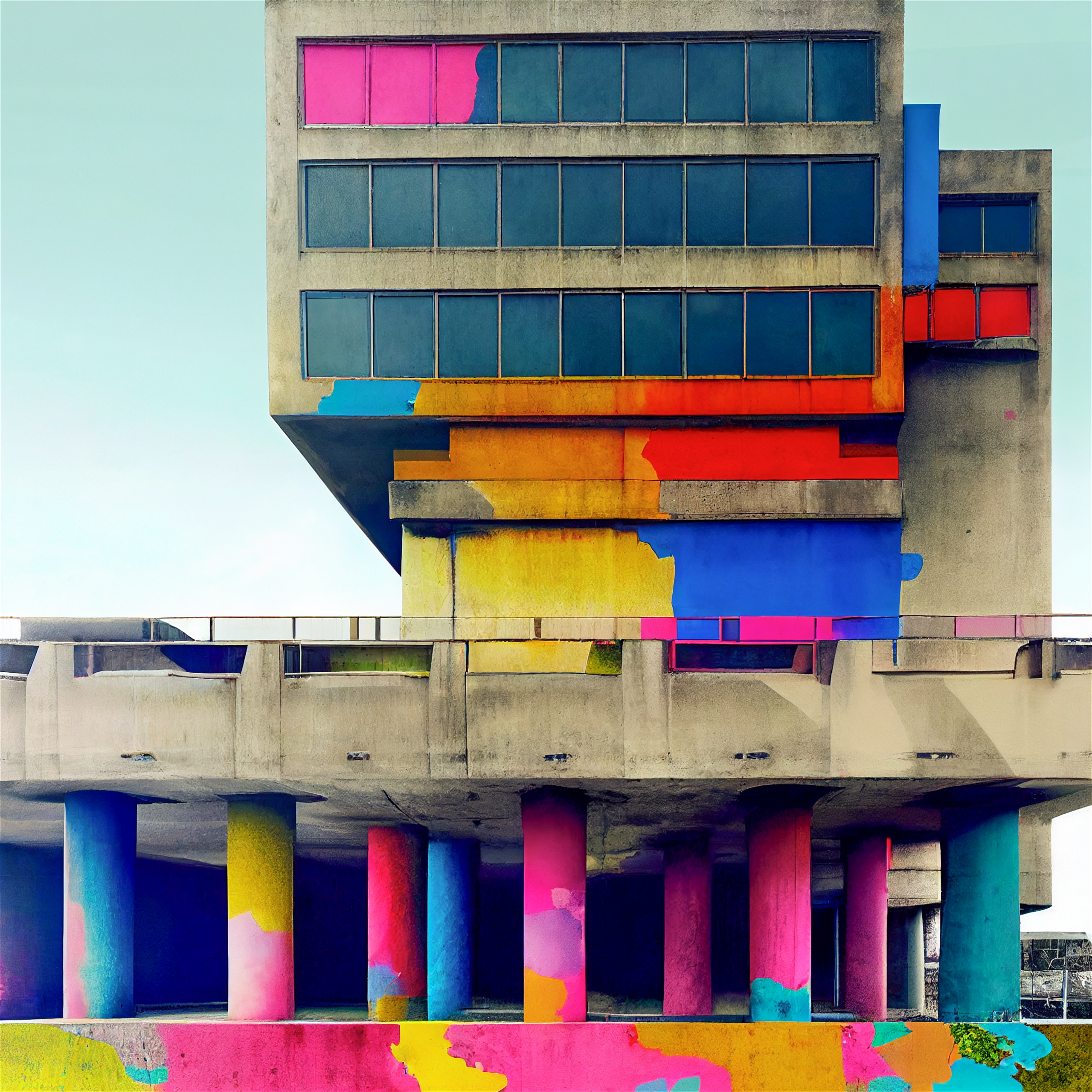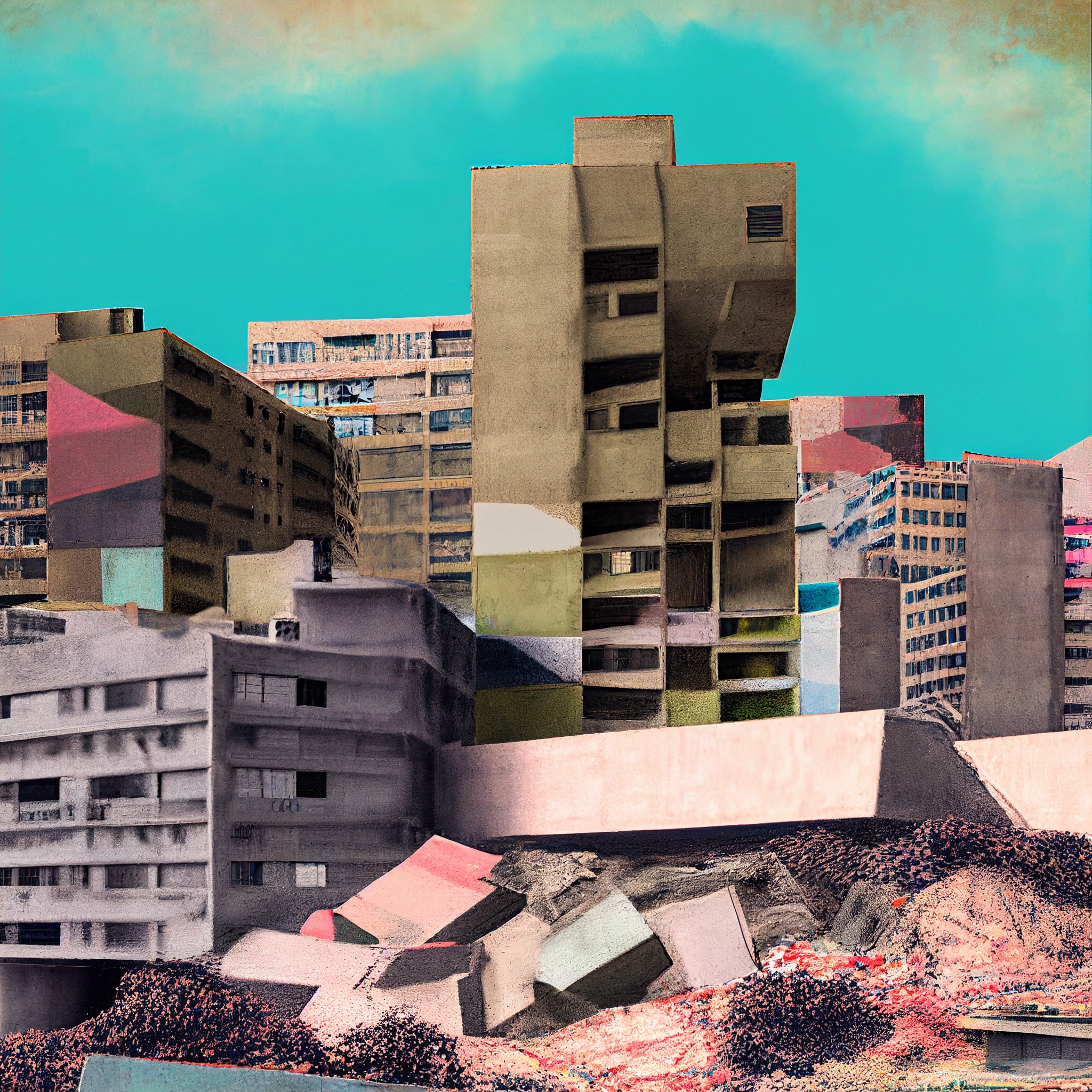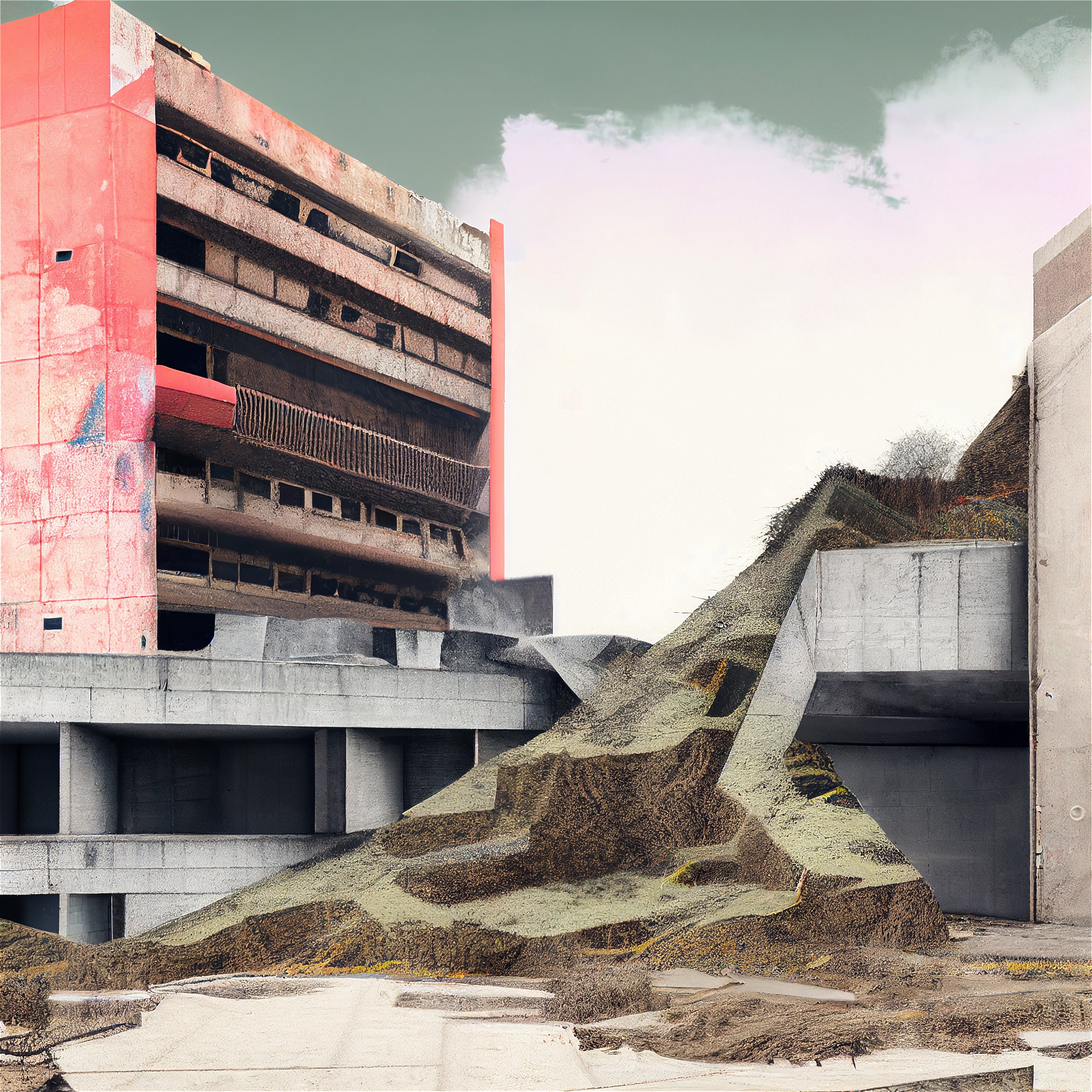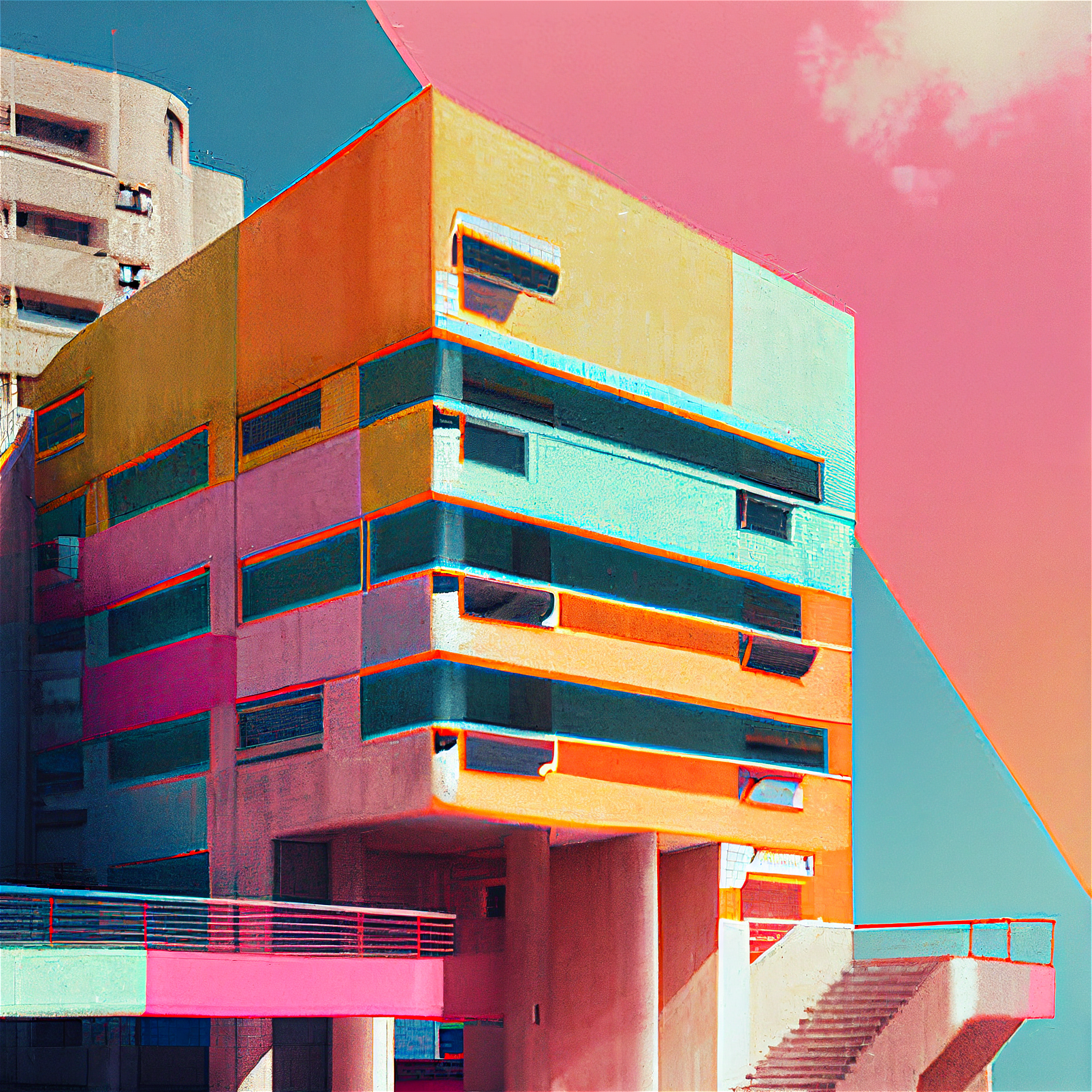 Proposition visuelle sur l'architecture urbaine du XXème siècle, en forme d'hommage aux utopies critiques des années 1970. Cette recherche aborde l'identité des paysages post-modernes dans un style brutaliste réhaussé par une polychromie en transformant radicalement la perception. Les images ont été réalisée avec l'assistance des premiers logiciels d'IA.
