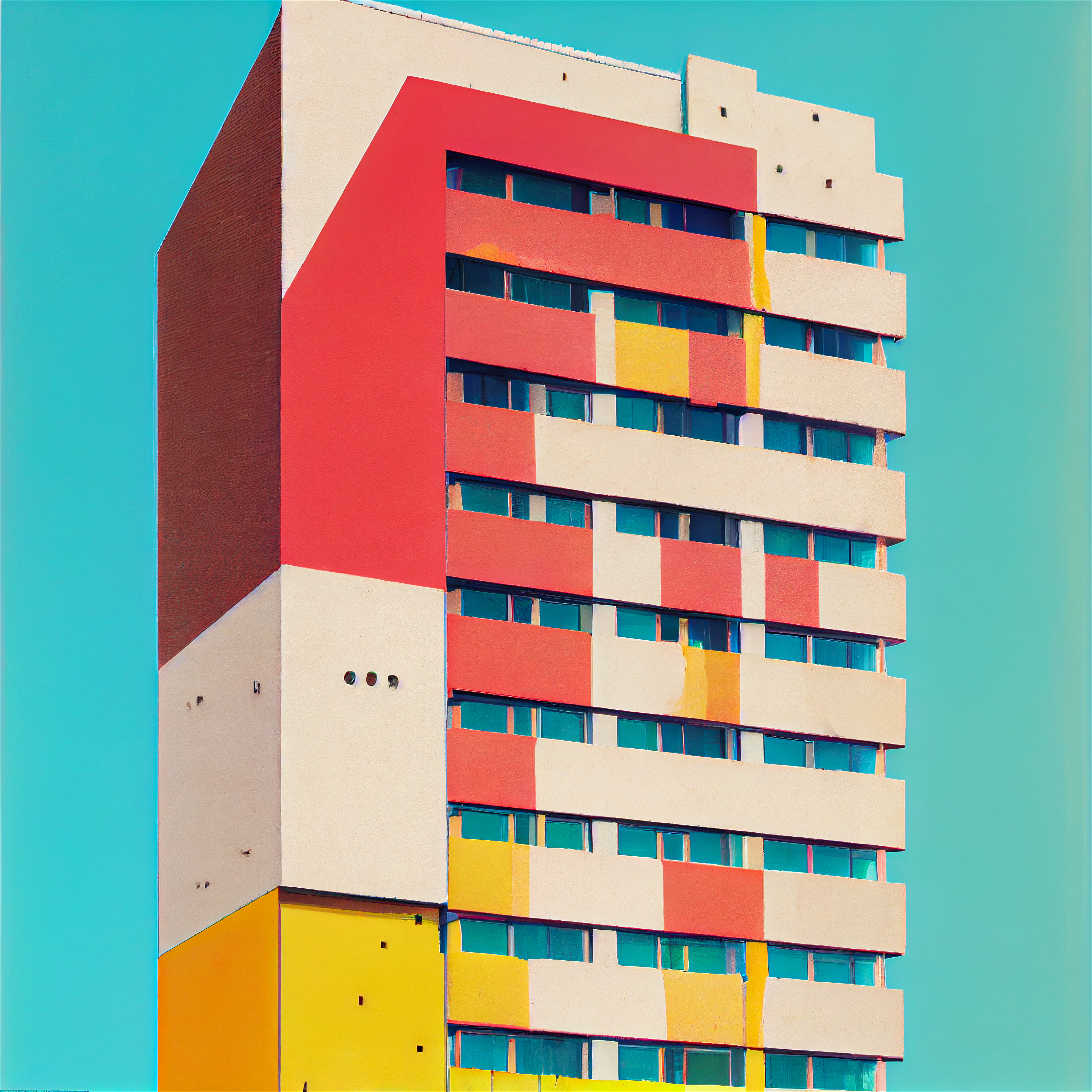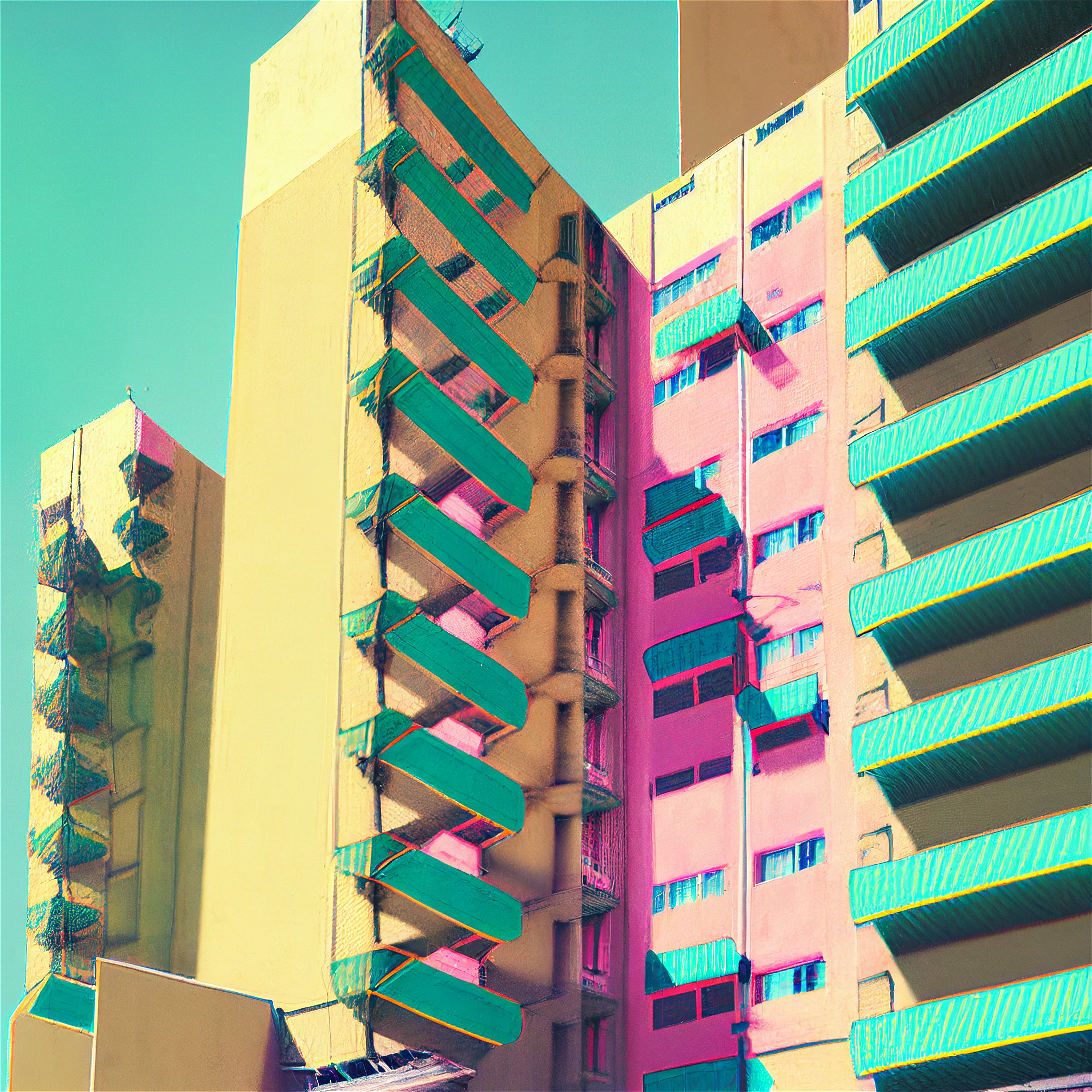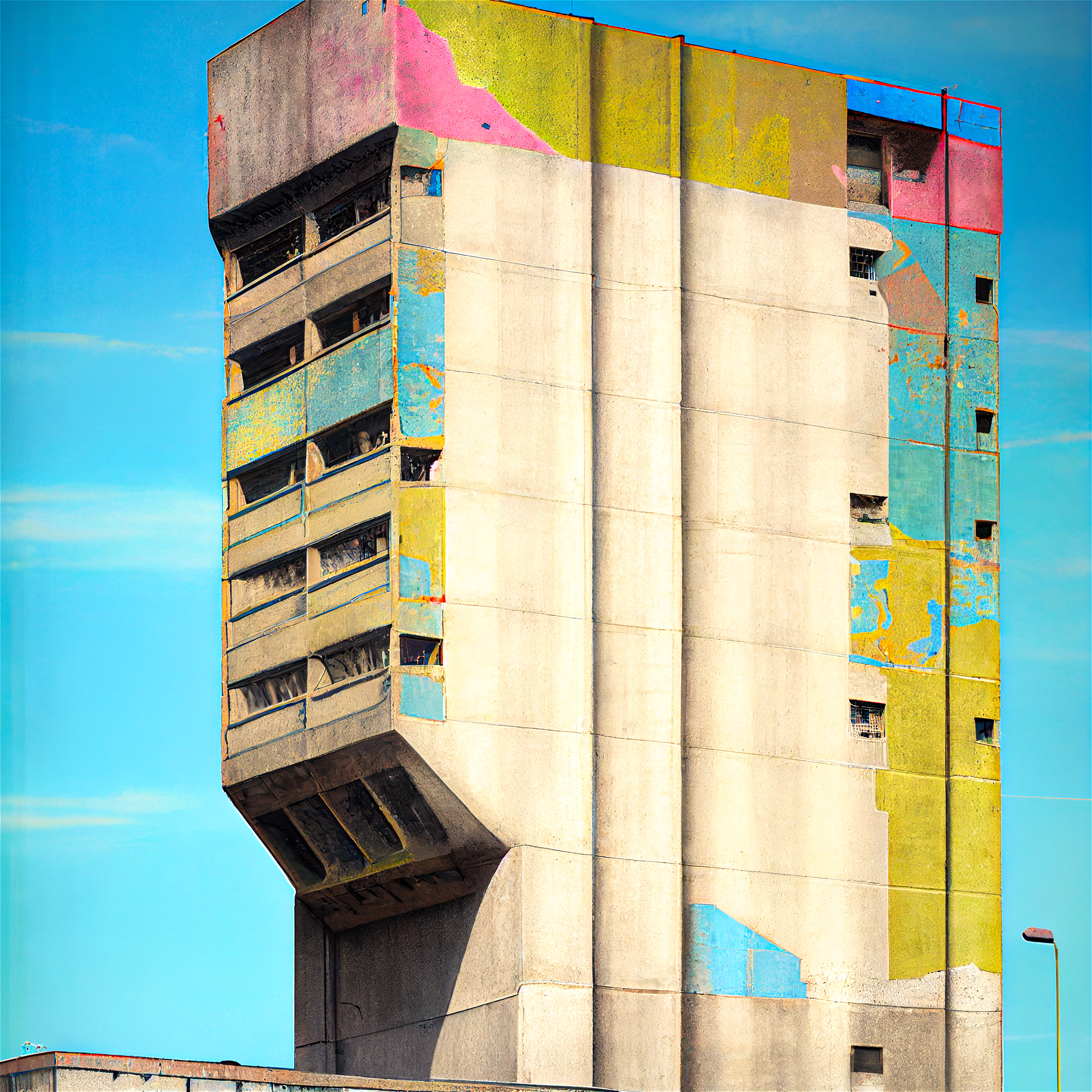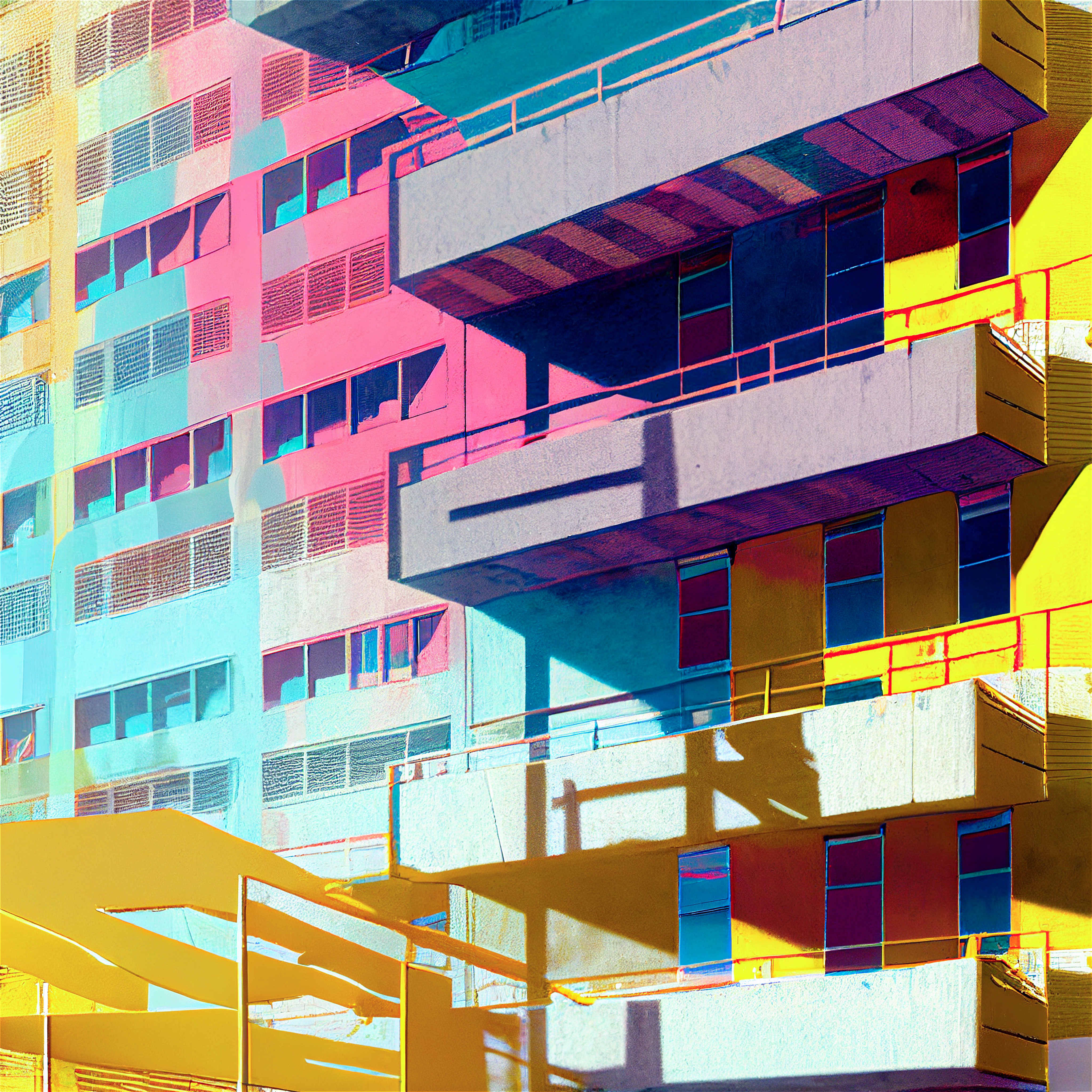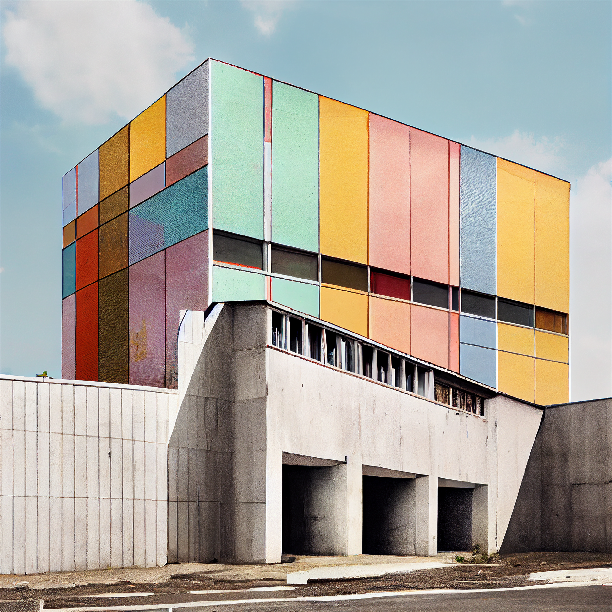 Proposition visuelle sur l'architecture urbaine du XXème siècle, en forme d'hommage aux utopies critiques des années 1970. Cette recherche aborde l'identité des paysages post-modernes dans un style brutaliste réhaussé par une polychromie en transformant radicalement la perception. Les images ont été réalisée avec l'assistance des premiers logiciels d'IA.