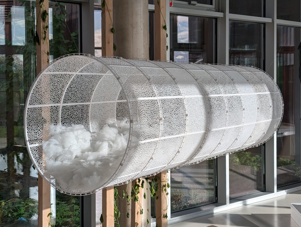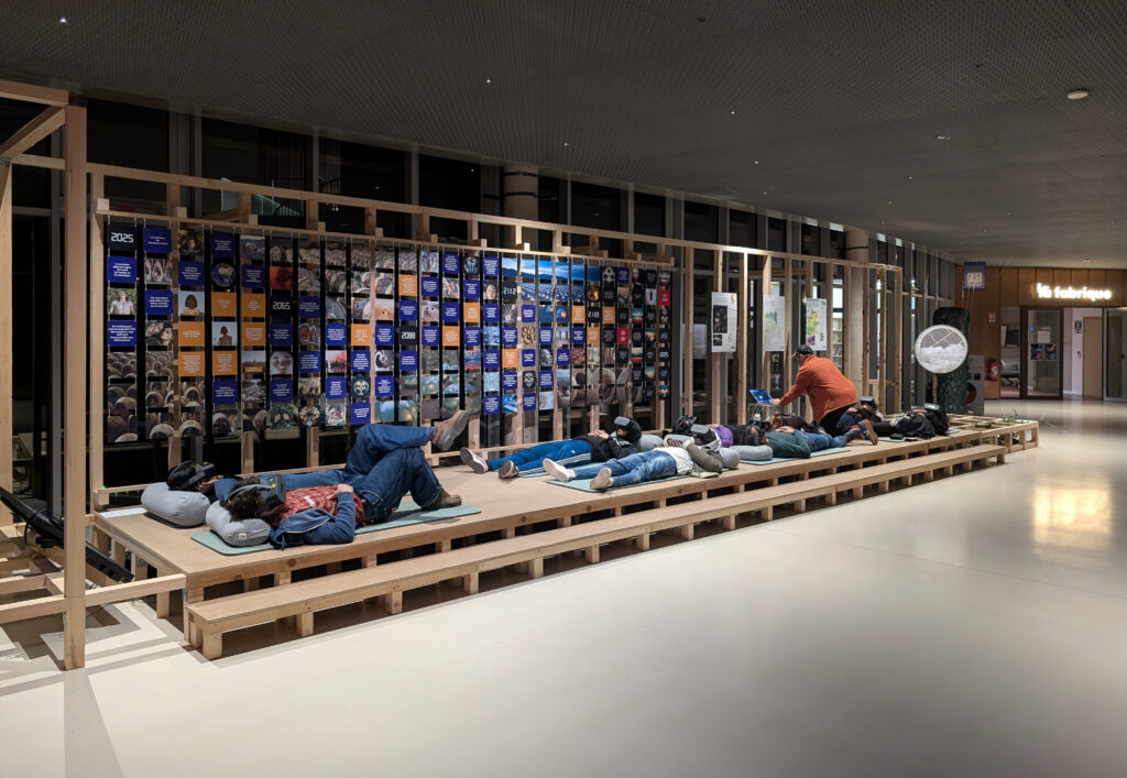 A first iteration of this approach was carried out during the creation of a scenographic space for the exhibition at Le Cube in Garges. The installation consists of a picture rail combined with a platform supporting eight reclining seats, allowing users to access media while in the sleeping position: the video of the opening conference, podcasts, and the XR experience. This approach allows the experience to be shared with a specific audience for exhibitions.