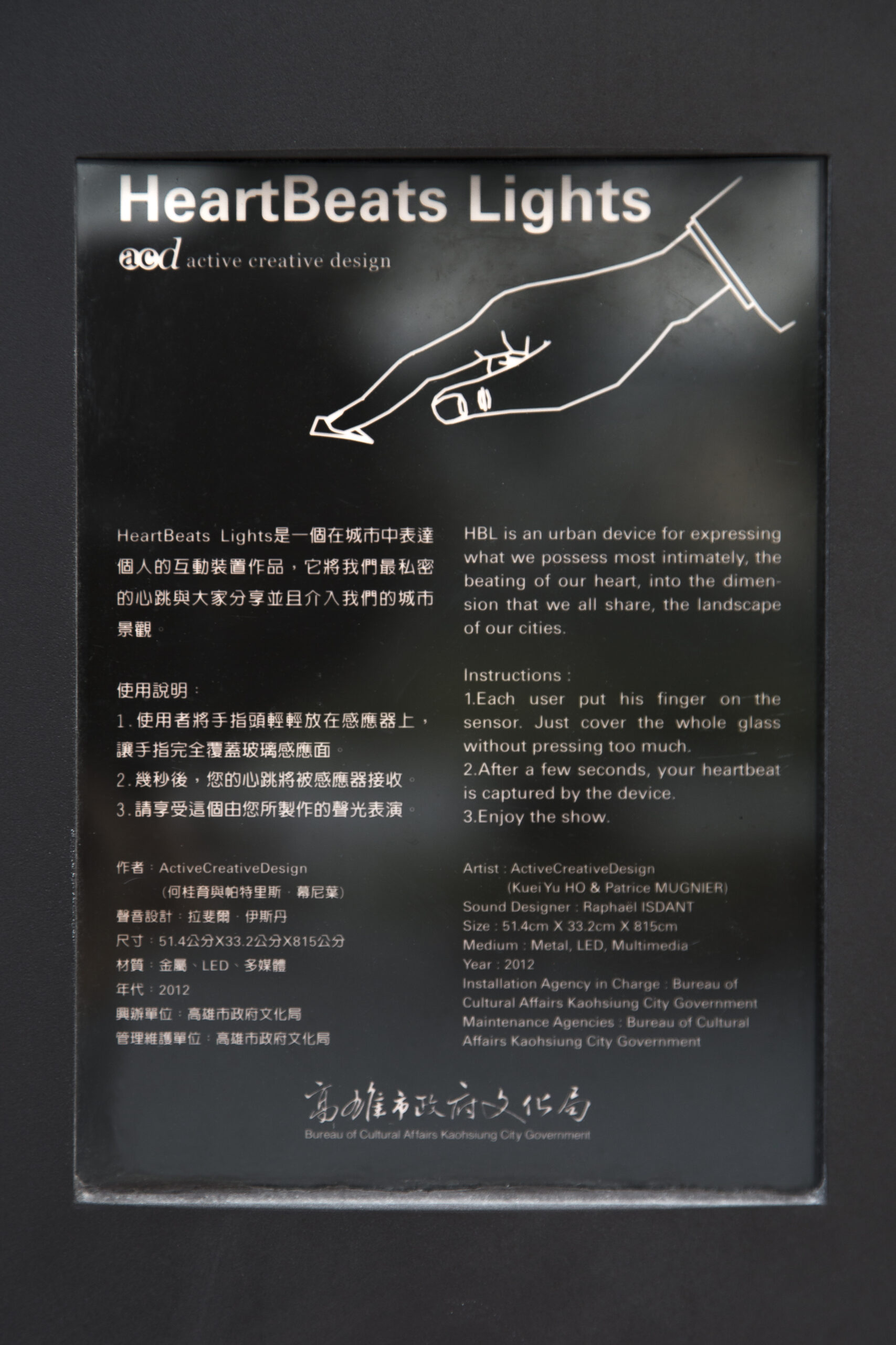 Production, conception et réalisation, étude technique, design mobilier, programmation, interaction, suivi de fabrication, installation sur site : Active Creative Design / Design sonore : Raphaël Isdant / Production : Pier 2 Art Center, Kaohsiung