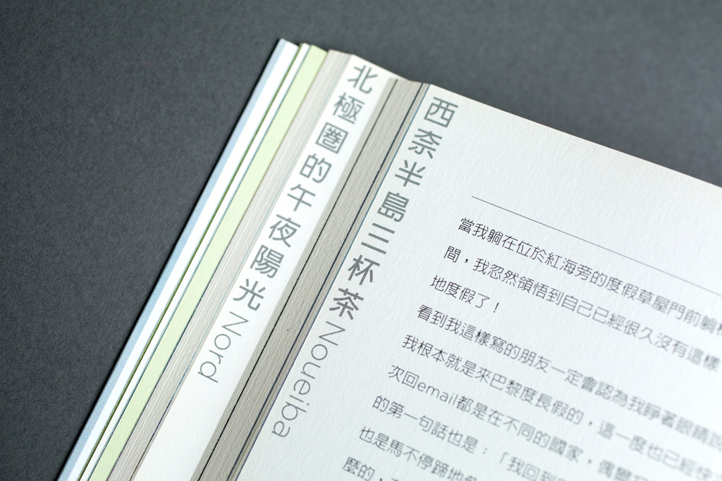 Pour les Éditions China Times, Kuei Yu Ho a réalisé le design graphique de l’ouvrage “L’esprit de voyage”. L’auteur Ken y décrit, à travers le récit de ses itinérances, la philosophie d’un voyageur asiatique ouvert aux rencontres humaines et à la découverte de nouveaux paysages. Le graphisme reprend ainsi l’idée du carnet de voyages tout en y ajoutant un élégant travail sur l’image et la typographie.