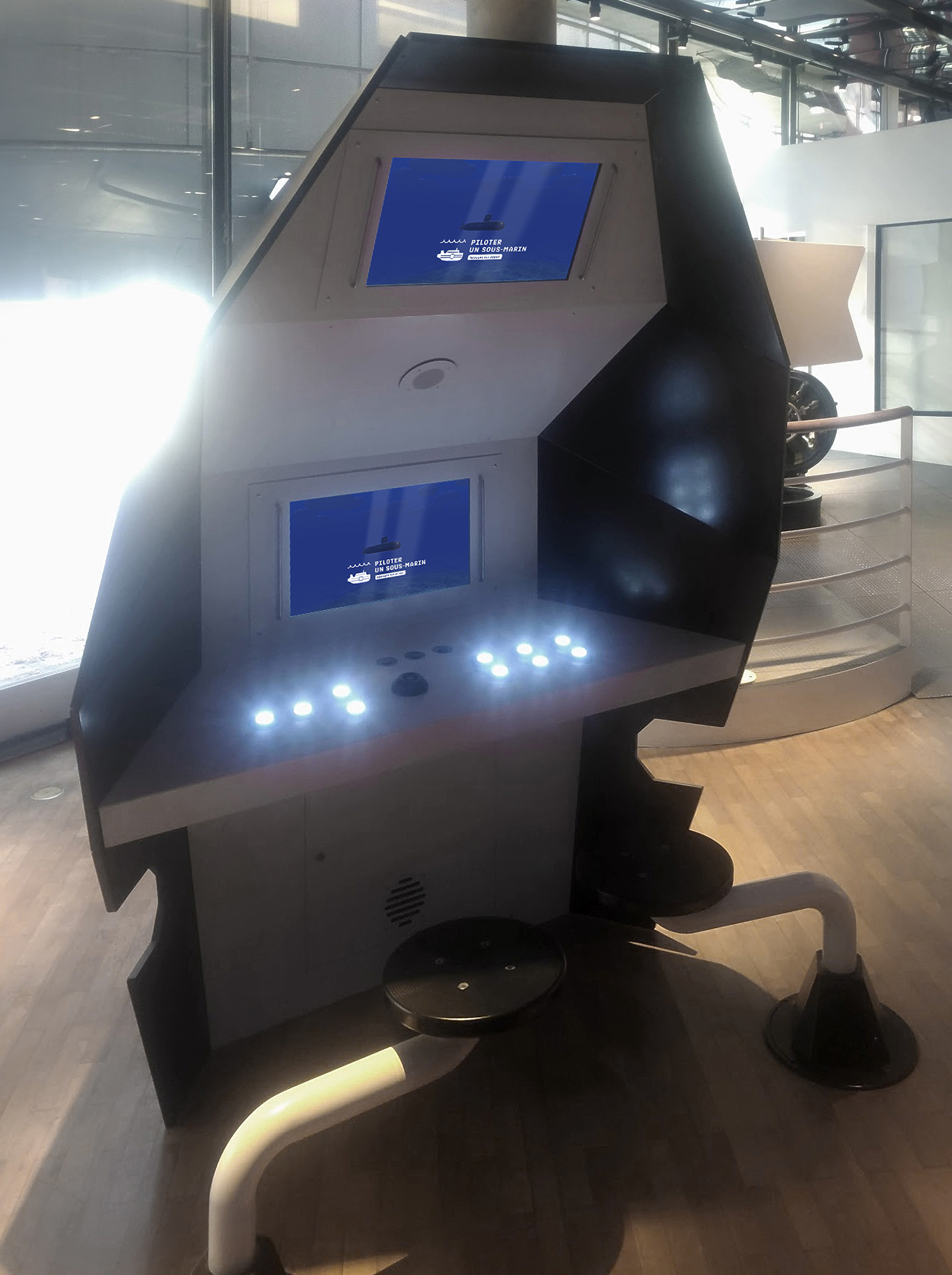Destinée à initier un large public aux enjeux du pilotage d’un sous-marin, le dispositif met en scène une interface physique de contrôle reprenant les commandes nécessaires à la navigation, complétée par 2 écrans, l’un destiné au pilote, l’autre au public situé derrière. L’application propose deux différents modes de navigation, correspondants à deux niveaux d’apprentissage. Le mode initiation propose 5 exercices abordant l’ensemble des manœuvres : plongée, faire surface, pesée, assiette, pilotage. Le mode expert permet d’effectuer une mission complète dans des conditions proches du réel, en navigation à l’aveugle, grâce aux seules indications des instruments. La mission consiste à naviguer dans la mer de Weddell, en Antarctique, à la recherche d’une trouée dans la glace, pour y faire surface.