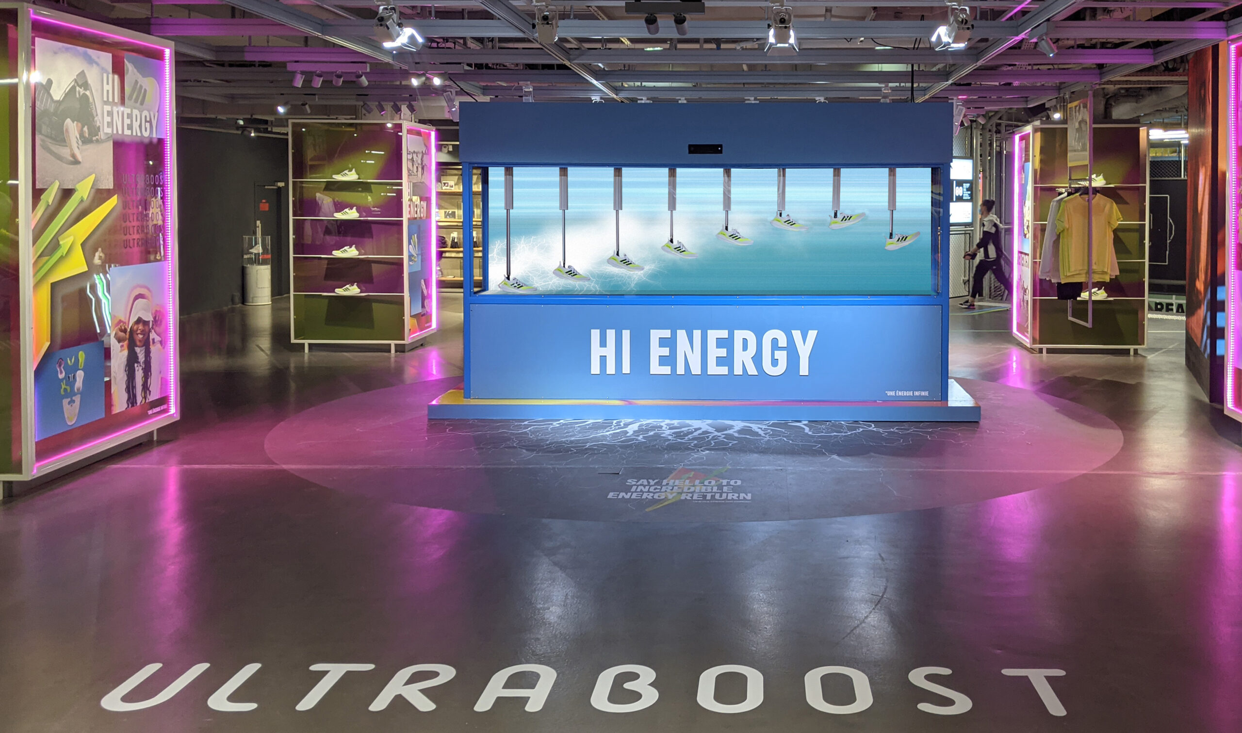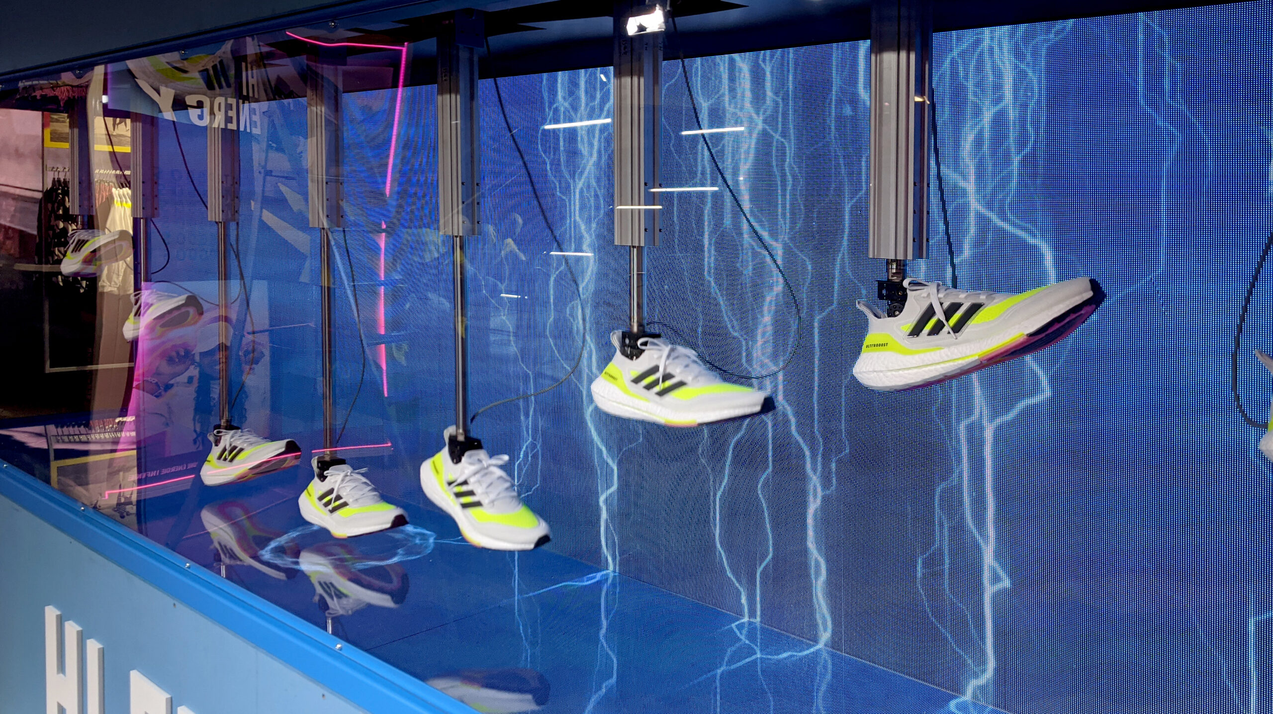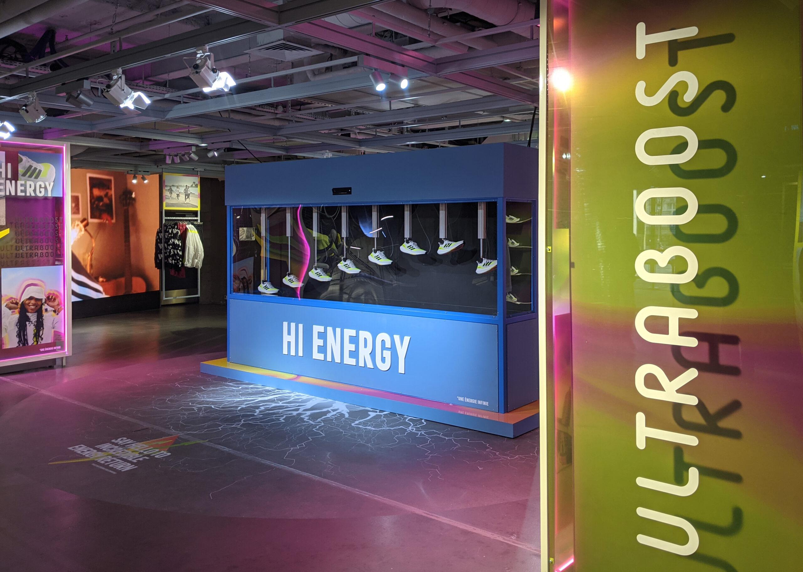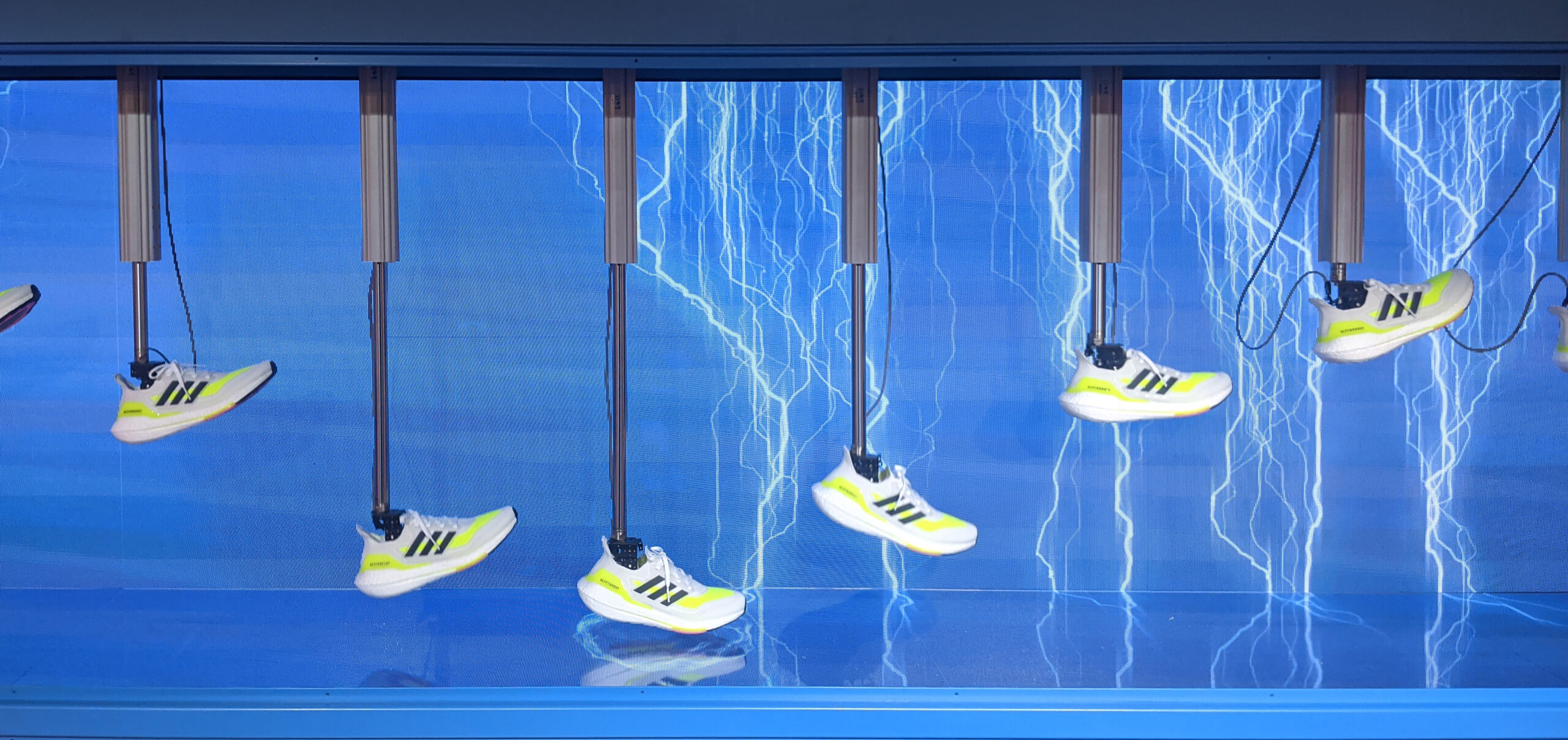 A l'occasion de la sortie du nouveau modèle de chaussures Adidas Ultraboost, Active Creative Design a réalisé pour le concept store des Champs Élysées une vitrine multimédia associant mécatronique et motion design. Elle reproduit la foulée d'un coureur sur un banc test composé de 8 chaussures animées par autant d'actionneurs industriels et de servomoteurs. En interaction avec la clientèle, le dispositif affiche en complément la diffusion de médias temps réels immersifs.